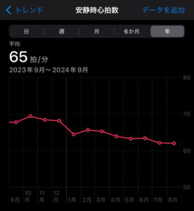適度な運動を続けながら、少しずつエクササイズ時間を増やしていることもあり、体力がついてきたのか、安静時心拍数も順調に下がっていて、心身ともに良い方向へ向かっているようです。