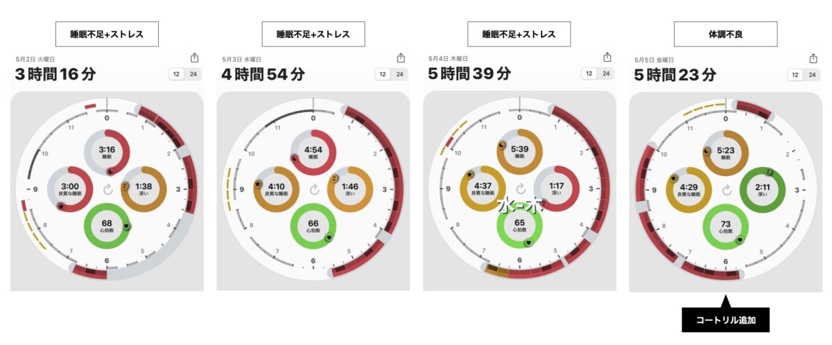 体調を保つには、最低でも6〜7時間の睡眠が必要なのですが、この時期の睡眠解析を振り返ると、明らかに睡眠不足が続いていました。5月2日は中途覚醒があり、連休のラストスパートとなった5月4日は活動量が過剰になり、その日をきっかけに症状が悪化しました。